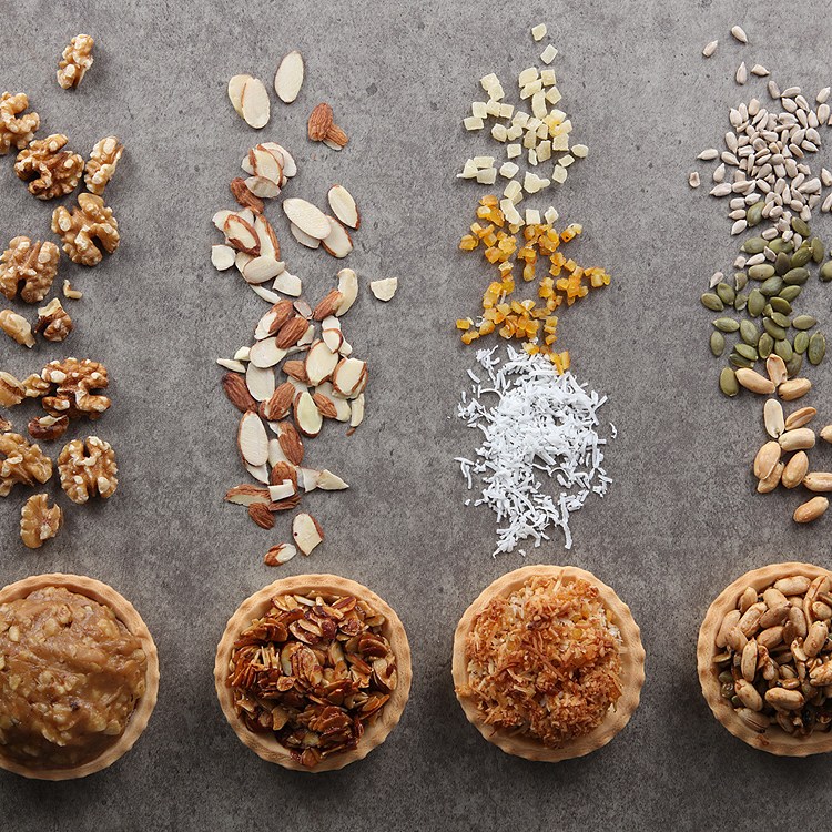 Are you a pie? A cookie? I’m a tart. Four different textures that feel like pie and cookie: walnut tart, almond tart, Hawaiian tart, and seed tart.