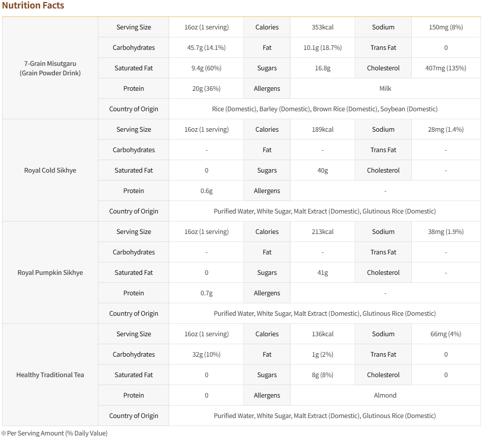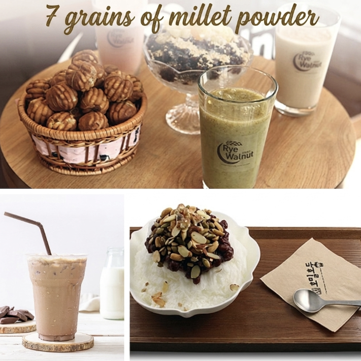 A uniquely developed rye-walnut blend, roasted with seven healthy domestic grains (barley, brown rice, glutinous rice, white beans, etc.). Available in 7-grain shakes, 7-grain powdered rice, and 7-grain walnut patbingsu.